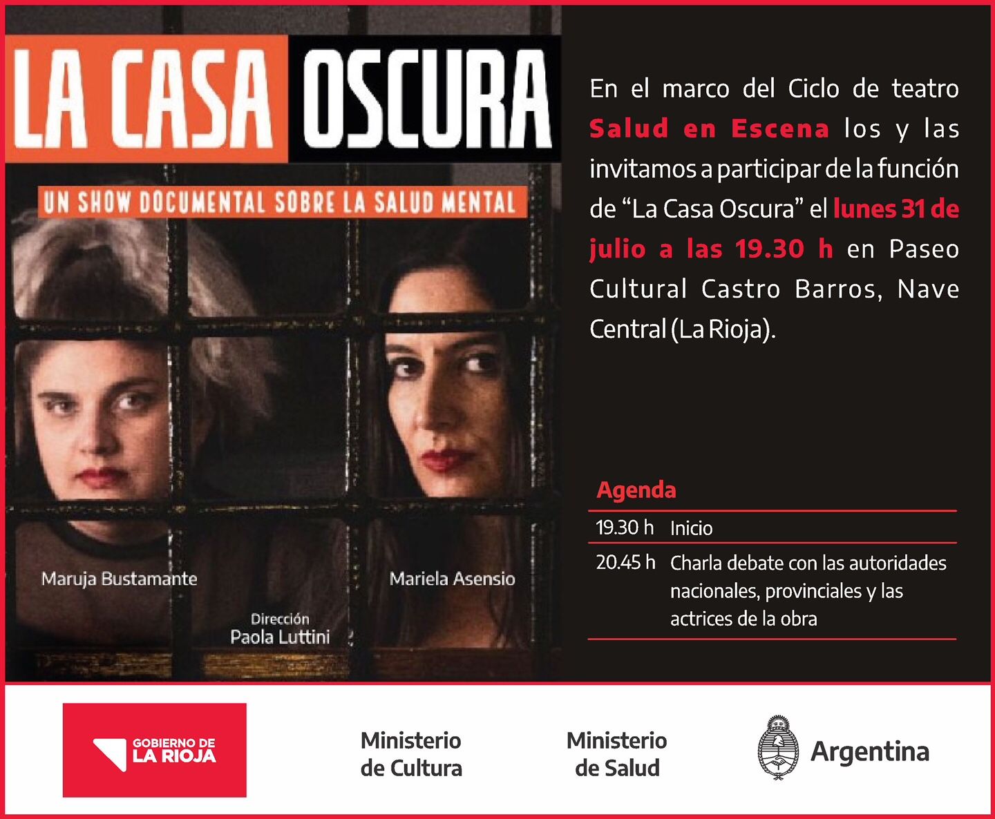 En este sentido, hoy lunes a las 19.00hs. se llevará a cabo una presentación de la obra “La Casa Oscura”. De esta acción participarán el Ministerio de Salud de la Nación; el Ministerio de Cultura de la Nación; y tanto el Ministerio de Salud como la Secretaría de Culturas de la provincia.