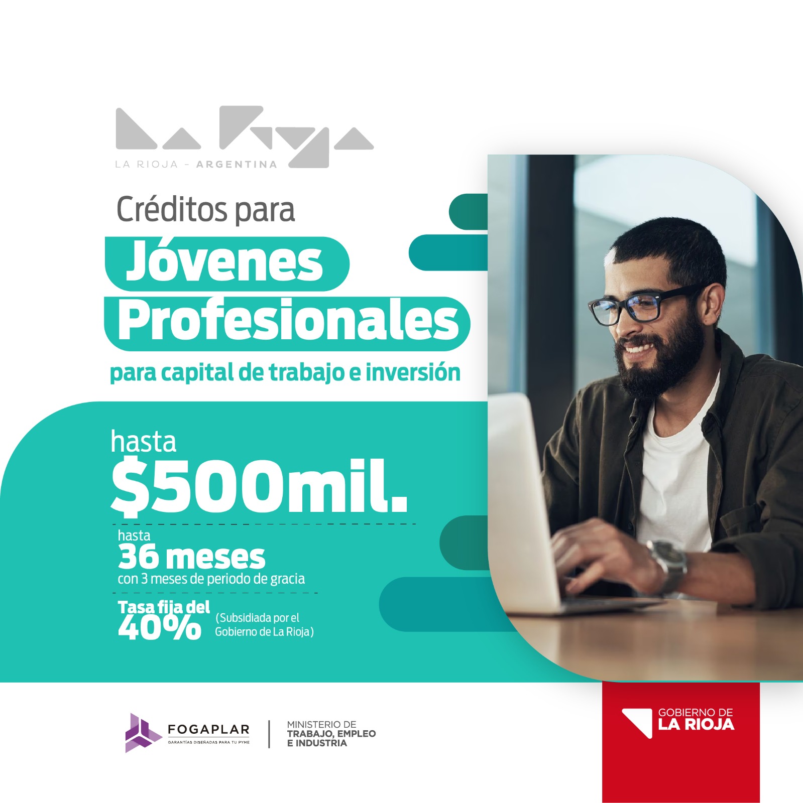 Los créditos están destinados a jóvenes profesionales con título de grado que no superen los 40 años de edad; con garantía de Fogaplar 100% bonificada y un monto de hasta $500.000 en 36 cuotas y una tasa fija del 40%. Los mismos son destinados a capital de trabajo e inversión, compra de equipamiento o capacitaciones y se podrán solicitar hasta el 30 de noviembre del corriente año.