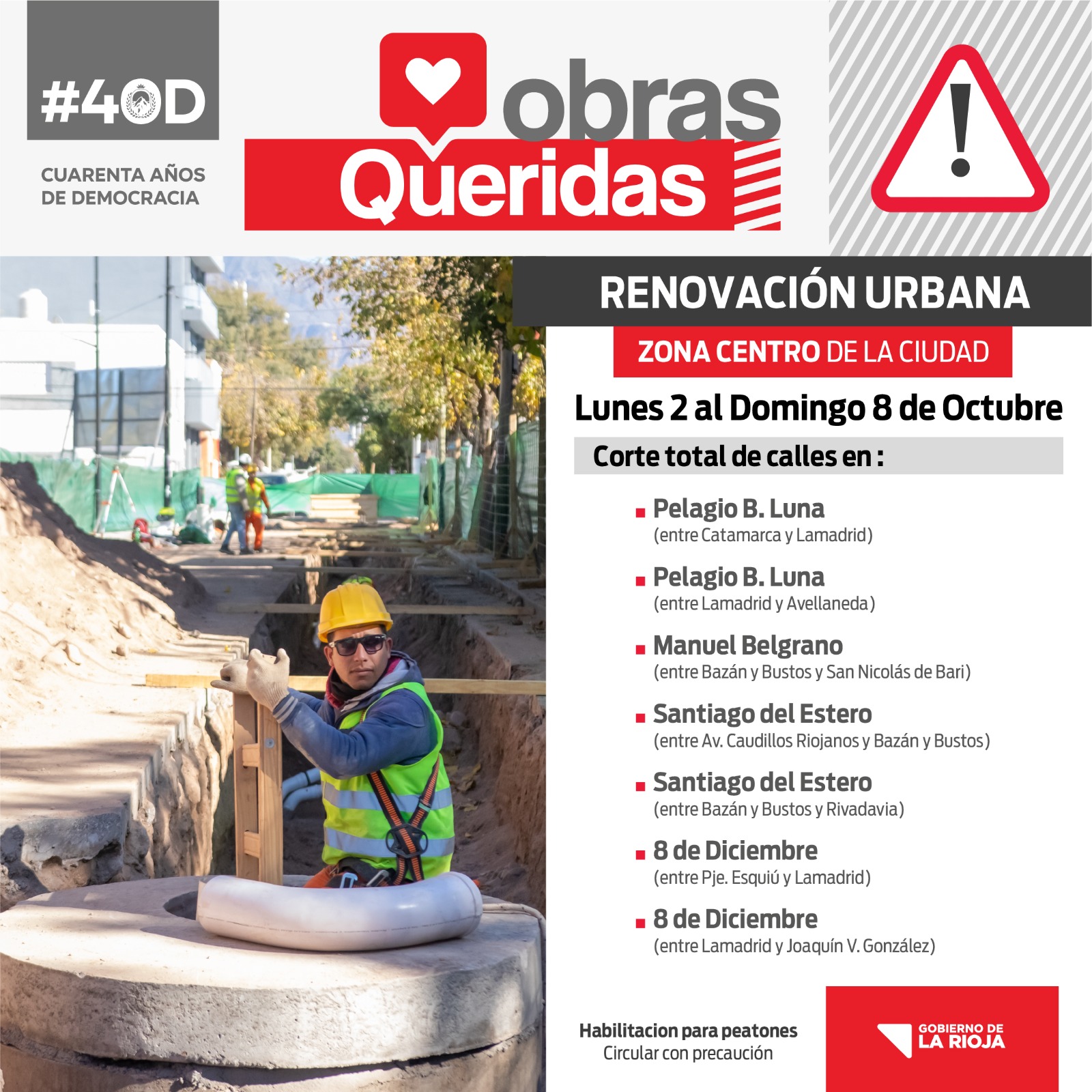 El Gobierno de La Rioja comunica el cronograma de cortes de calles por las obras de Renovación Urbana y Desagües Pluviales del área central de la ciudad Capital, previstos desde el lunes 2 al domingo 8 de octubre.