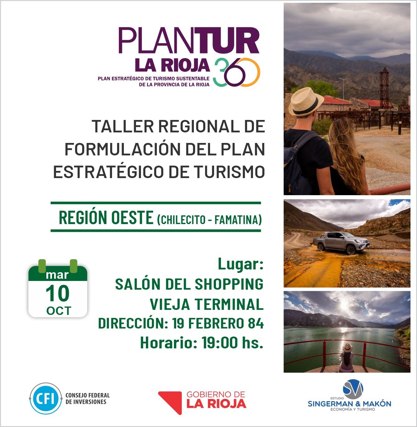 Con el firme prop贸sito de potenciar a la provincia como destino tur铆stico competitivo, llega a Chilecito y Famatina el Taller Regional de Formulaci贸n del Plan Estrat茅gico de Turismo. El mismo- dirigido al sector p煤blico y privado- propone desarrollar estrategias de planificaci贸n y gesti贸n para llevar adelante una actividad tur铆stica s贸lida, eficiente y sustentable.