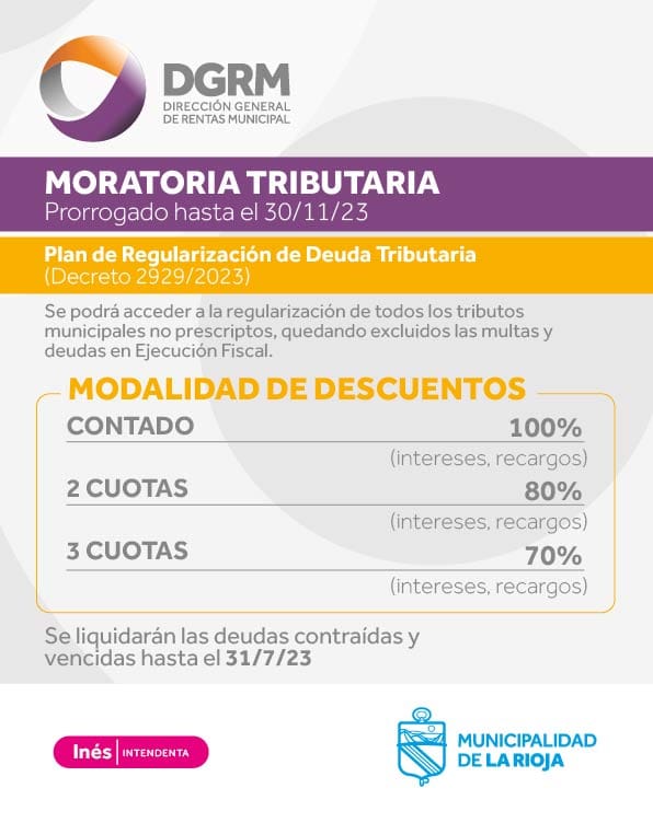 El plan no contempla multas y deudas en ejecución fiscal y, excepto CACIS, se podrá tramitar vía página web en el sitio https://www.municipiolarioja.gob.ar/ botón rentas digital.