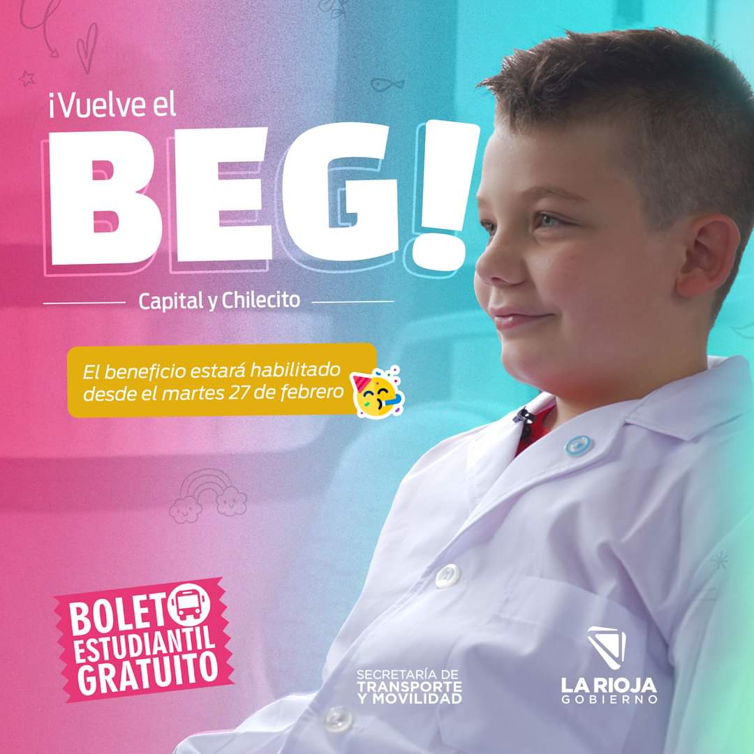 El Gobierno de La Rioja, a través de la Secretaría de Transporte y Movilidad, anunció que estudiantes de todos los niveles educativos podrán acceder este año también al Boleto Estudiantil Gratuito. Se trata de 40 viajes gratis por mes, no acumulables, que se traducen en dos boletos habilitados de lunes a viernes en el transporte público de pasajeros.