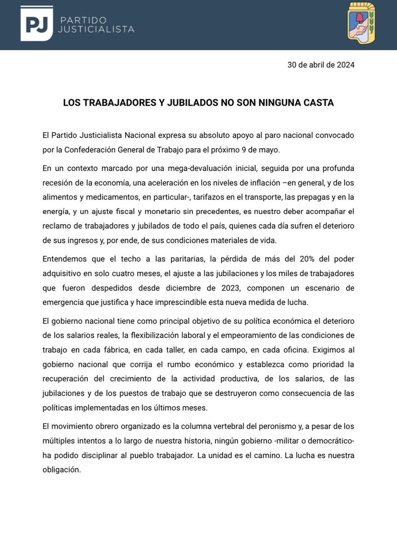 El PJ expresó su apoyo al paro general de la CGT: "Los trabajadores y jubilados no son ninguna casta".
