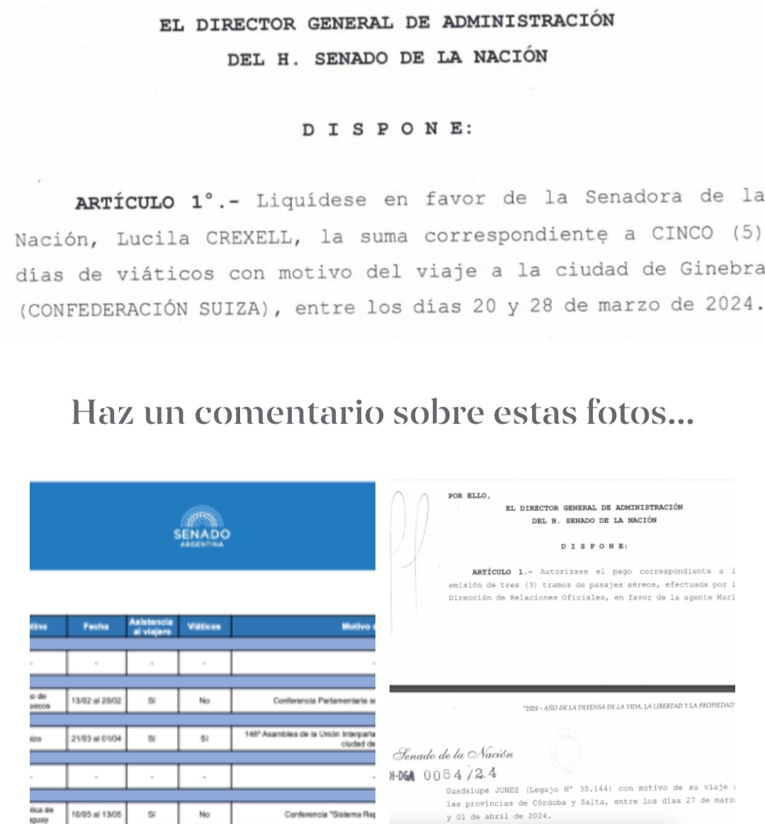 Lucila Crexell puede dar fe de ello. La senadora, quedó en el ojo de la tormenta cuando salió a la luz que -por esas casualidades- el Gobierno le ofreció ser embajadora de la Unesco en el mismo momento que se discutía la Ley Bases, gozó de la generosidad del Senado. En marzo, la por ahora legisladora -aunque ya se imagine en su oficina de París y con un salario en dólares- fue invitada a participar en la Asamblea Interparlamentaria en Ginebra, Suiza. Federico Pávito, a quien Villarruel puso al frente de la Dirección General de Administración del Senado, firmó la disposición 54/2024 para que Crexell reciba cinco días de viáticos y un seguro de viajero por siete días.
