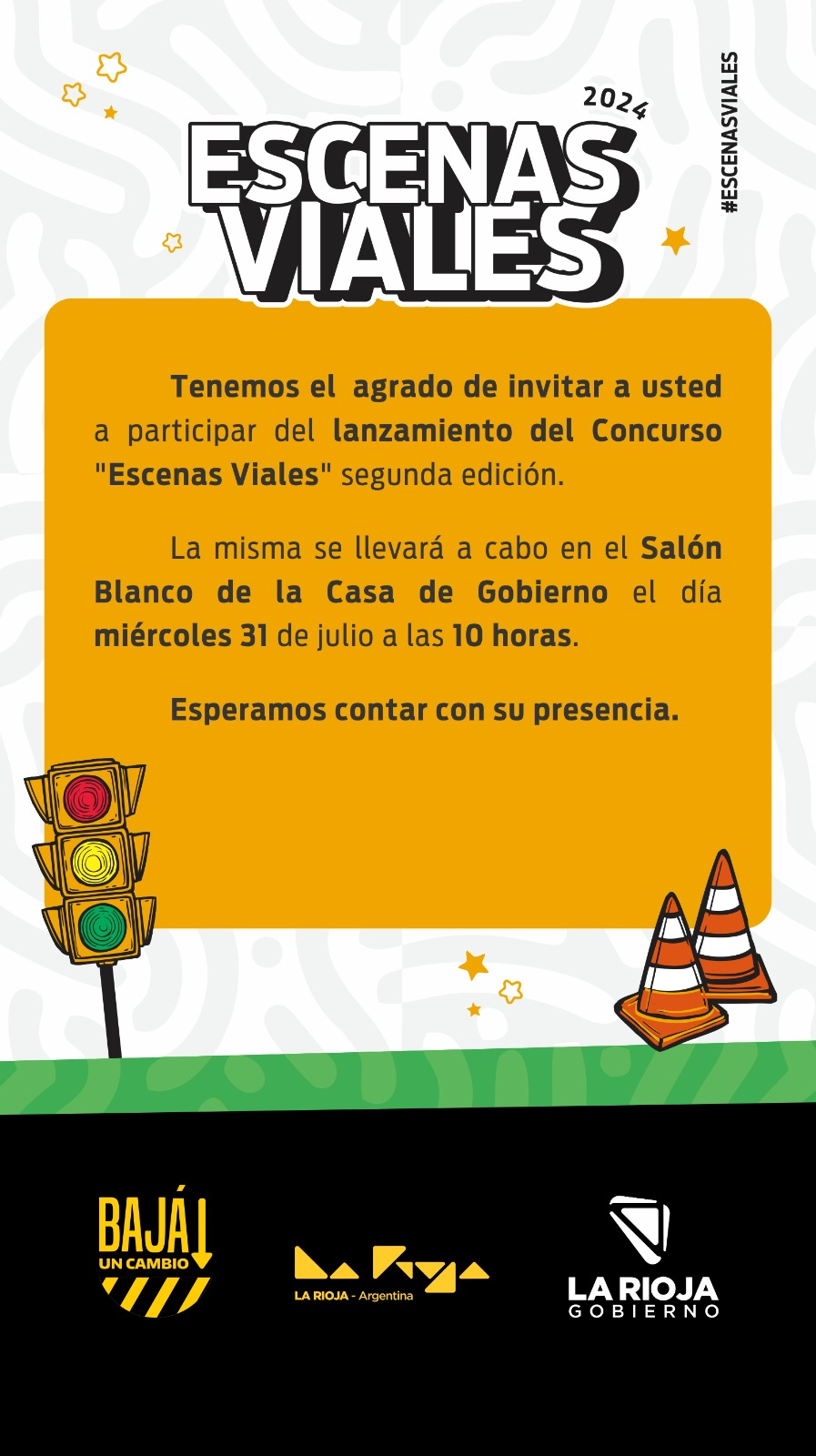 El lanzamiento del concurso "Escenas Viales" 2024 se llevará a cabo en el Salón Blanco de la Casa de Gobierno, este miércoles 31, a las 10 horas.