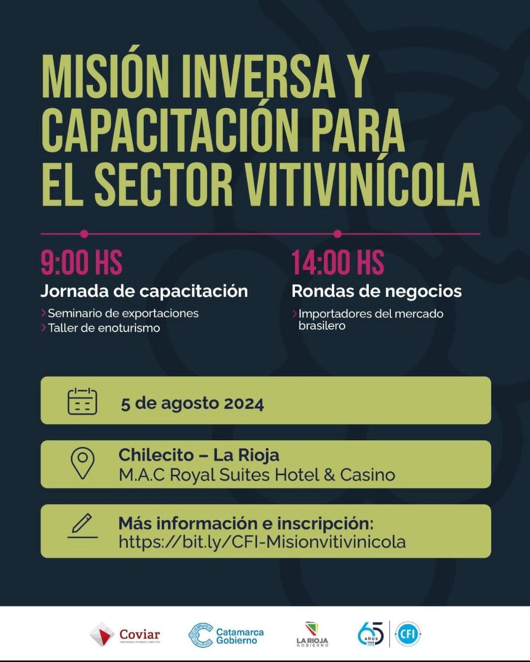 El ministerio de Trabajo, Empleo e Industria, a través de la dirección de Comercio Exterior llevarán a cabo la Misión Inversa y Capacitación para el sector Vitivinícola de La Rioja.
