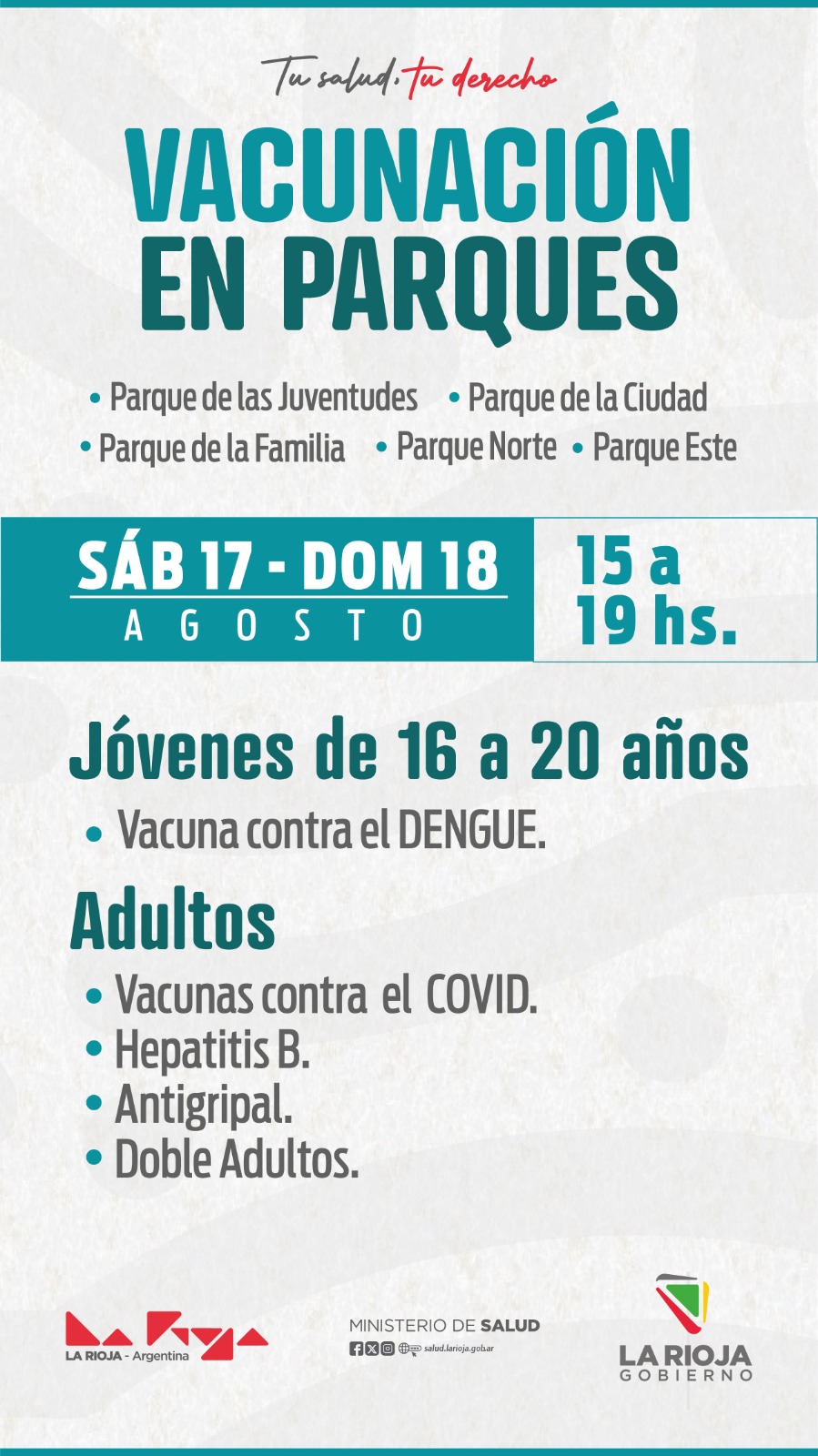El Ministerio de Salud informó que, se desplegará un operativo de vacunación los días sábado 17 y domingo 18 de agosto en los Parques de la Juventud, de la Ciudad, de la Familia, Norte y Este. En la oportunidad se aplicarán vacunas covid, doble adulto, antigripal, hepatitis B y a los jóvenes de 16 a 20 años la vacuna contra el dengue.