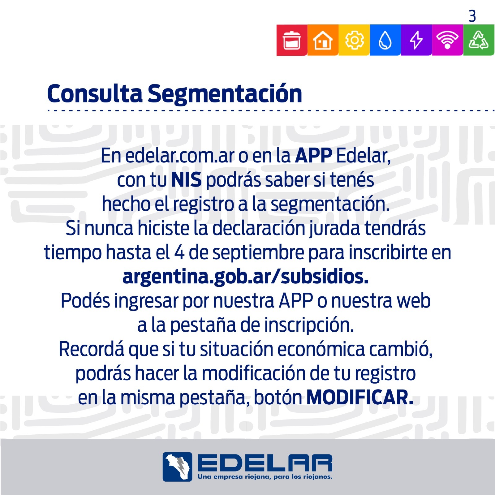 En www.edelar.com.ar o en la App Edelar, con el número de NIS se puede saber si el usuario tiene realizado el registro a la segmentación.