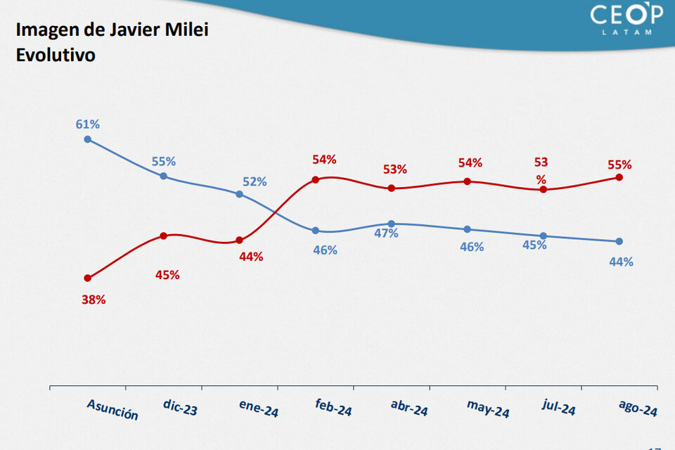 “A pesar del feroz ajuste que azotó a los argentinos --señala Bacman--, hay un 39 por ciento de la población que se considera oficialista. Es una base de apoyo de la gestión libertaria. En la vereda de enfrente, los opositores en los últimos meses vienen creciendo, y en la actualidad ya representan el 46,5 por ciento. En el medio, hay un exiguo 14 por ciento que se considera independiente. Da la impresión que no hay mucho espacio para la tibieza y que tarde o temprano esa franja se inclinará para un lado u el otro".