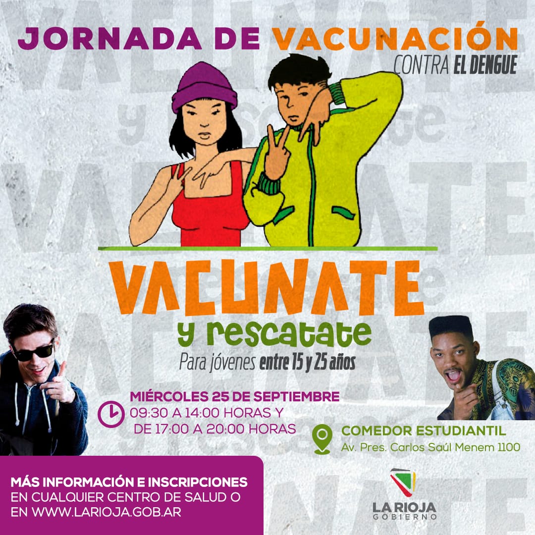 La jornada “Vacunate y rescatate”, organizada por el Ministerio de Salud y la Secretaría de Juventudes está orientada para jóvenes entre 15 y 25 años. La misma tendrá lugar el próximo miércoles 25, de 9:30 a 14:00 y de 17:00 a 20:00 horas, en el Comedor Estudiantil, ubicado en la avenida presidente Carlos Saúl Menem 1100.