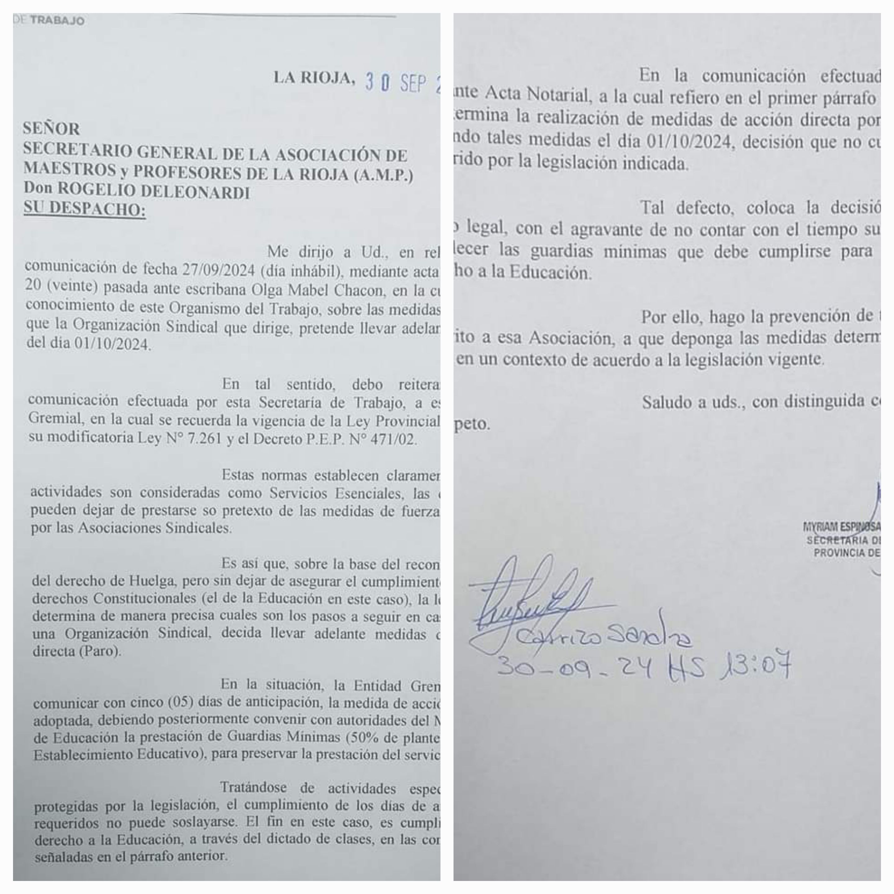 La notificación que lleva la firma de la secretaria de Trabajo, Miriam Espinosa, advierte que AMP presentó el informe de las medidas de fuerza sin respetar el tiempo que establece la ley, es decir 5 días hábiles, por lo que se le solicitó que deponga de las mismas y establezca los canales de diálogo con las autoridades del ministerio de Educación para garantizar "el derecho a la educación de toda la comunidad educativa de la provincia".