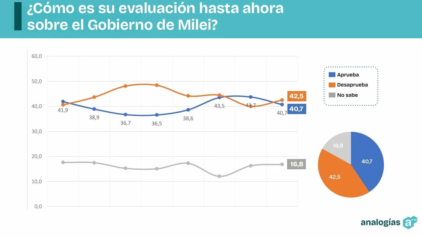 Según una encuesta de la consultora Analogías, Milei sufrió en el último mes una baja de tres puntos en su aprobación y quedó superado por quienes rechazan su gestión. Las expectativas positivas respecto a la marcha de la economía también cayeron fuerte aunque mantiene un margen de expectativa. El escándalo por la criptomoneda $LIBRA tiene un acto nivel de conocimiento entre la gente y la mayoría piensa que el Gobierno está involucrado y es corrupto.