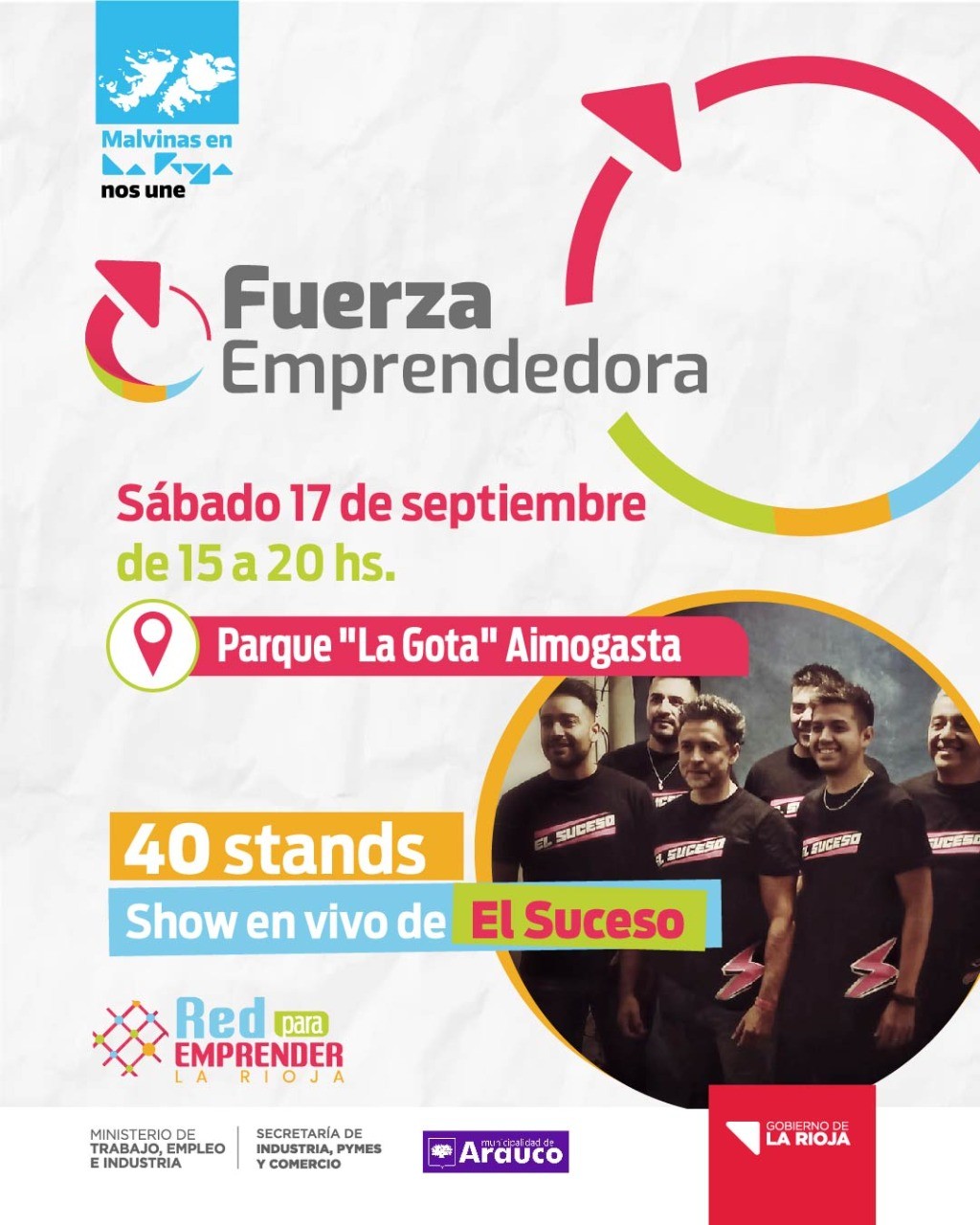 Organizada por el Ministerio de Trabajo, Empleo e Industria de la Provincia, en conjunto con la "Red para Emprender La Rioja" y el municipio del Departamento Arauco, este sábado 17 de septiembre se llevará a cabo la feria de Fuerza Emprendedora en el parque "La Gota" de Aimogasta.