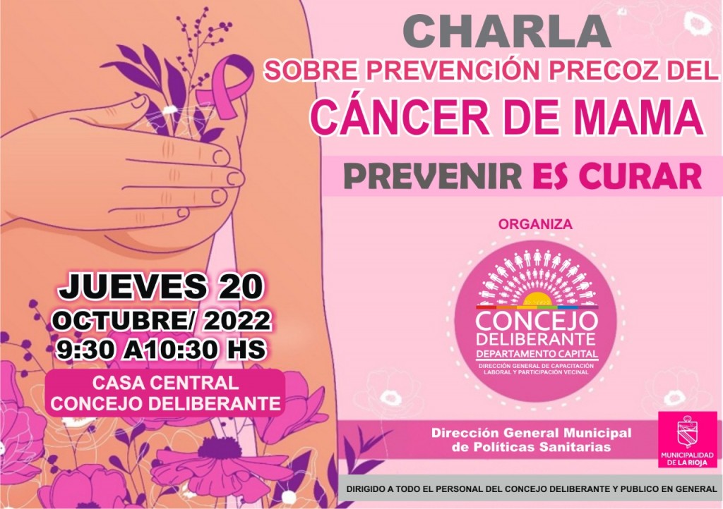 El jueves 20 de Octubre se realizará una charla sobre la prevención del cáncer de mama. Será a las 9.30 en el edificio central del Concejo Deliberante de la Capital."Prevenir es curar" está dirigido a todo el personal de la institución y será dictado por la Dirección General Municipal de Políticas Sanitarias.